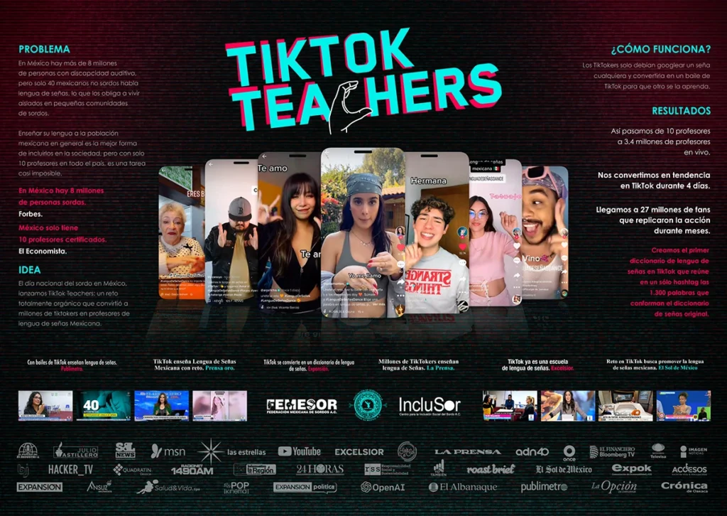 That’s why, on National Day of the Deaf, we launched TikTok Teachers. A completely organic challenge that took us from 10 teachers to 3.4 million teachers live. We became trending for four days and created the first sign language dictionary on TikTok, gathering in a single hashtag 1,300 words that make up the original dictionary.